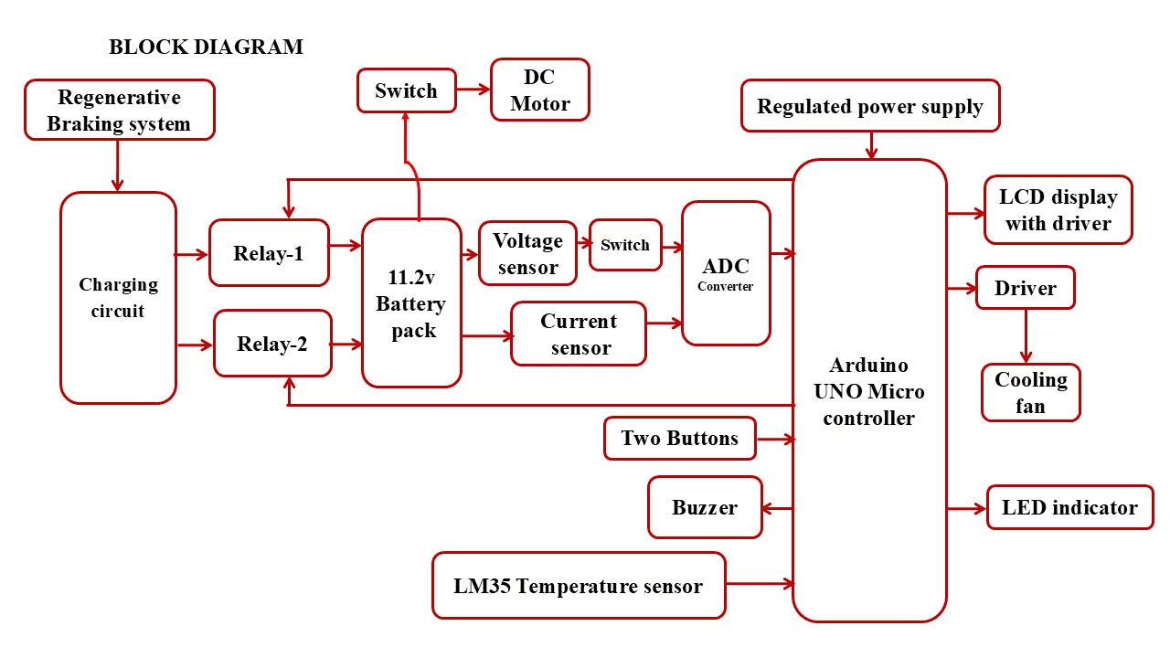 When the driver applies the brakes, the vehicle's kinetic energy is converted into friction between the brake pads and rotors. The electric motor in the vehicle switches to generator mode. The wheels transfer the kinetic energy to the generator. The generator converts some of the kinetic energy into electricity. The electricity is stored in the vehicle's battery. The controlling device of the whole system is ARDUINO UNO microcontroller. The integrated modules to the controller are temperature sensor, current sensor, Battery pack along with relays, buttons, Charger and LCD Module. When the battery pack gets drained, it will charge through relays. Here we are using two relays for fast and slow charging. Here DC MOTOR works as a vehicle. While running the vehicle microcontroller will display the Battery voltage, current, Temperature, SOC and SOH values on LCD module continuously. If the temperature value crosses the set limit, then microcontroller active the buzzer for alerts and turn ON the cooling fan to prevent the thermal damage. Based on the battery voltage it will charge the battery in two modes like fast and slow. Here relay works as a switch to on/off the charging connection. To achieve this task microcontroller loaded program written in embedded C language.