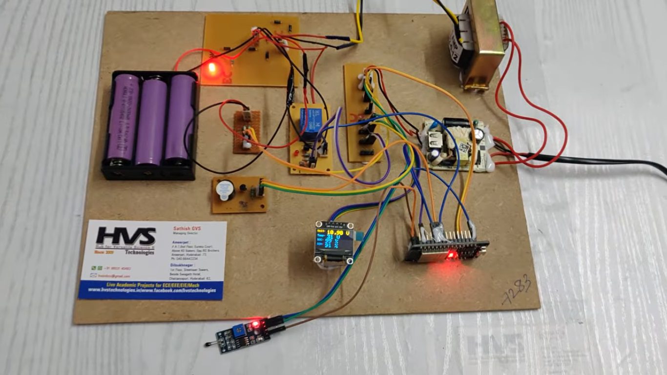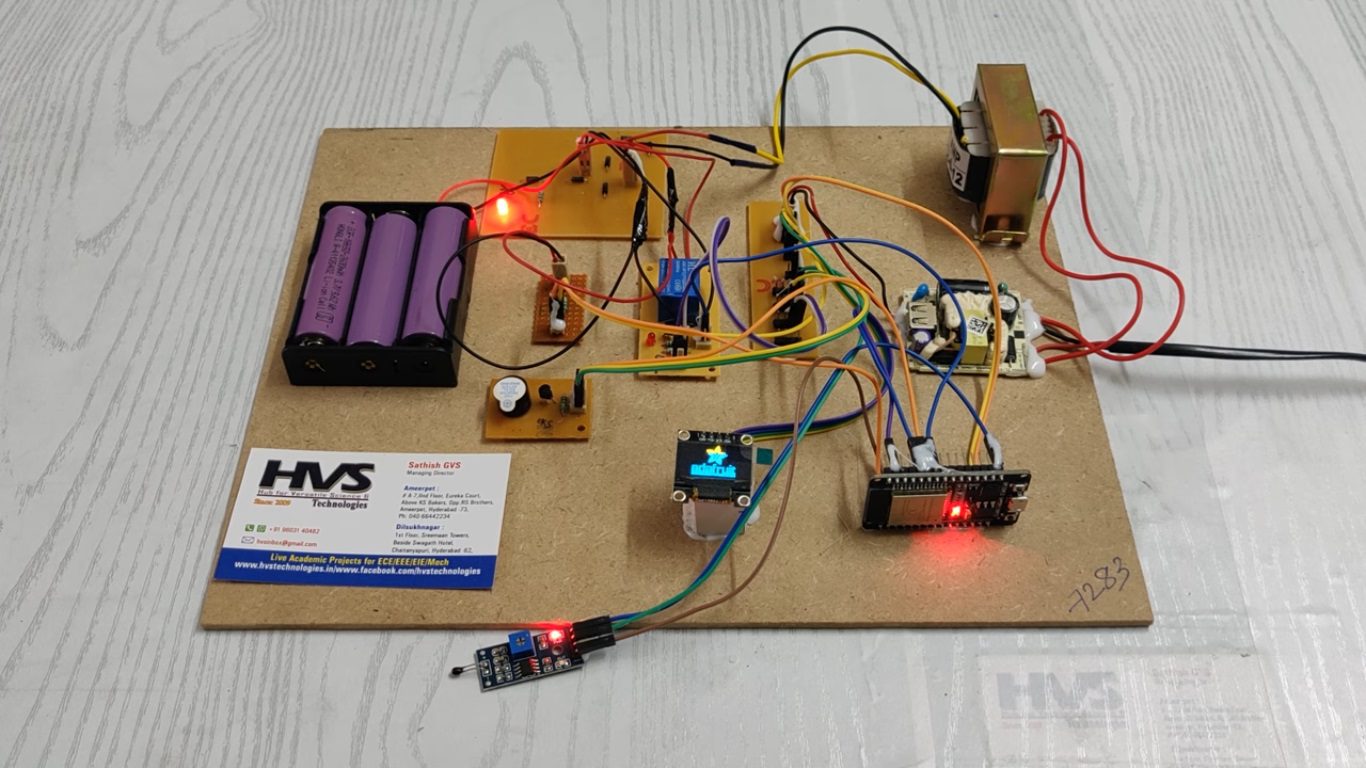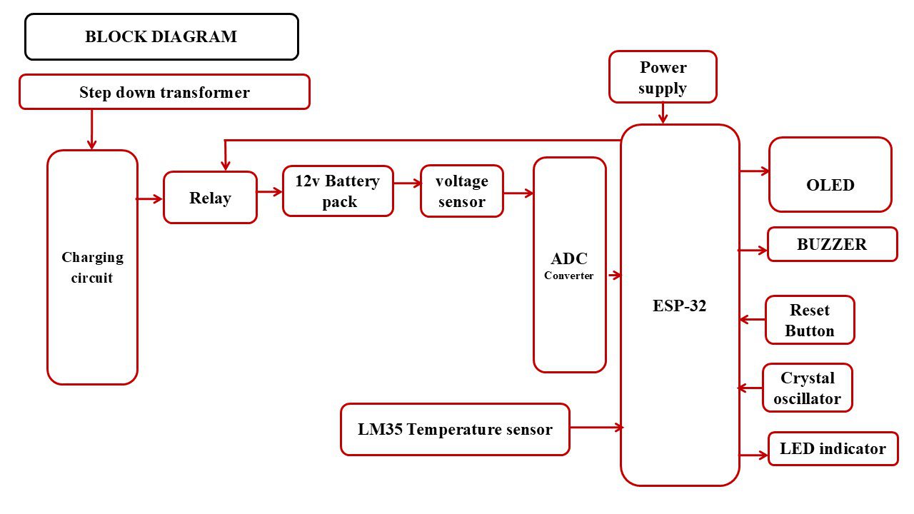 The ESP32 serves as the central controller of the system. Integrated modules include a temperature sensor, Li-ion battery pack with relay, charger, and an OLED display. When any of the Li-ion battery packs are drained, the system automatically activates the charger via the relay, and the voltage levels of each battery pack are displayed on the OLED. The system continuously monitors the temperature, and if it exceeds a predefined threshold, the ESP32 activates a buzzer to issue an alert.