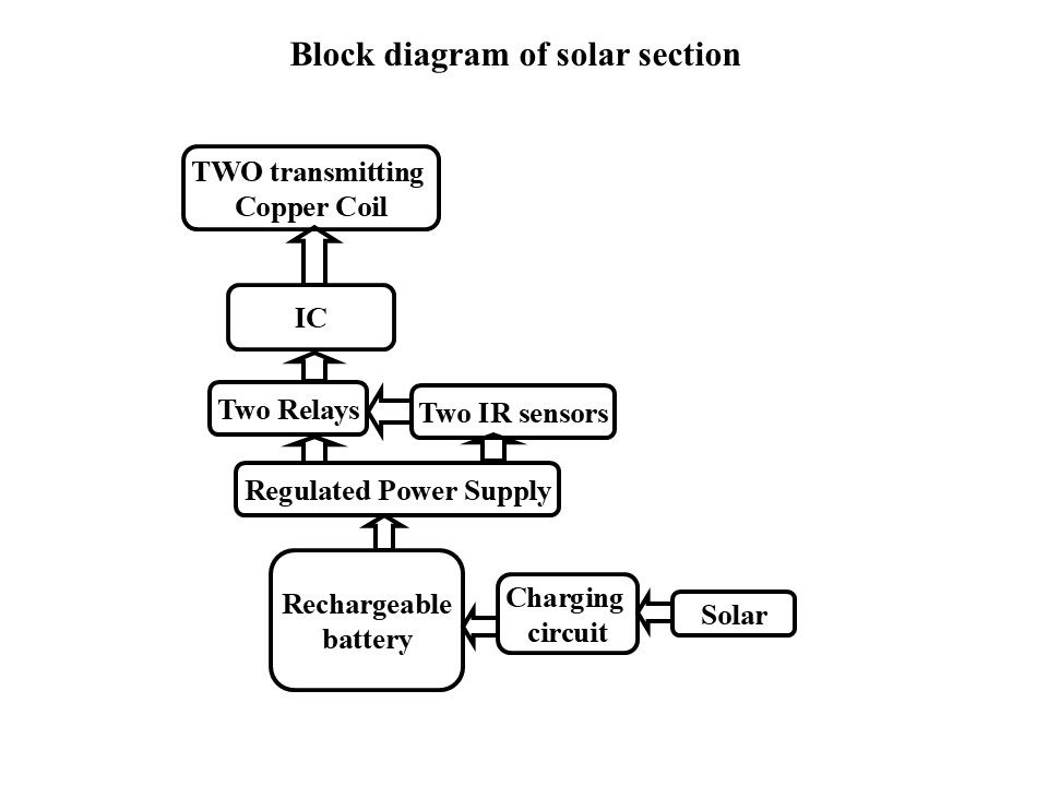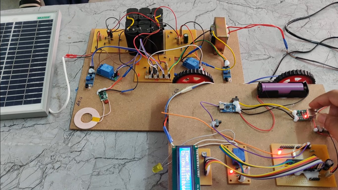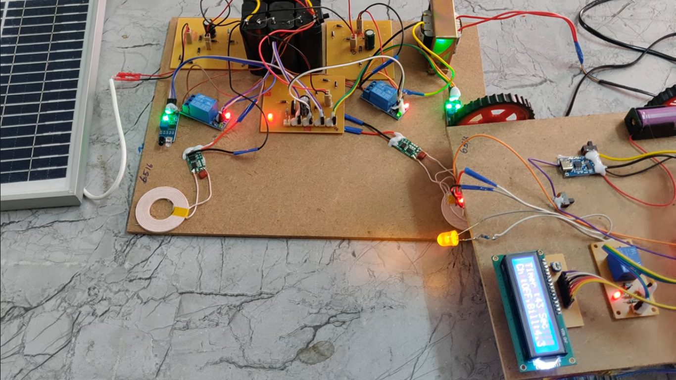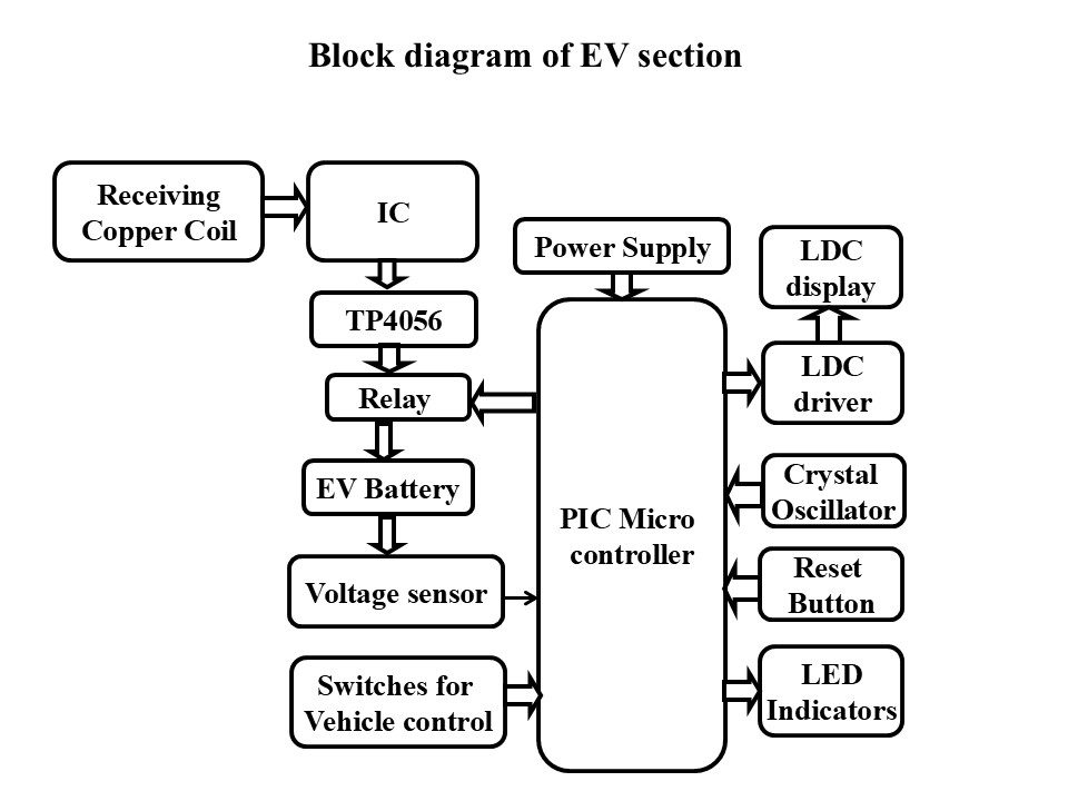 Wireless energy transfer or wireless power is the transmission of electrical energy from a power source to an electrical load without a conductive physical connection. Wireless transmission is useful in cases where interconnecting wires are inconvenient, hazardous, or impossible. The problem of wireless power transmission differs from that of wireless telecommunications, such as radio. In the latter, the proportion of energy received becomes critical only if it is too low for the signal to be distinguished from the background noise. With wireless power, efficiency is the more significant parameter.  A large part of the energy sent out by the generating plant must arrive at the receiver or receivers to make the system economical. The most common form of wireless power transmission is carried out using direct induction followed by resonant magnetic induction. The project consists of two self-resonating copper coils of same resonating frequency of about 100KHZ. One copper wire is connected to the power source (transmitter), while the other copper wire is connected to the device (Receiver).The electric power from the power source causes the copper coil connected to it to start oscillating at a particular (KHz) frequency. Subsequently, the space around the copper coil gets filled with nonmagnetic radiations. This generated magnetic field further transfers the power to the other copper coil connected to the receiver. Since this coil is also of the same frequency, it starts oscillating at the same frequency as the first coil. This is known as 'coupled resonance' and is the principle of Tesla. This project presents a solar-based wireless charging system for electric vehicles (EVs) integrated with battery monitoring and control using a PIC microcontroller. The system utilizes a solar panel to generate energy, which is stored in a rechargeable battery through a charging circuit. The stored energy is then transmitted wirelessly using transmitting copper coils. At the EV section user will control the vehicle through switches, power is received through a receiving coil and regulated using appropriate circuits, including a TP4056 charging module, to safely charge the EV battery. The PIC microcontroller continuously monitors battery parameters such as voltage and controls the charging process using relays. Additionally, IR sensors are used for detection and efficient power transfer control. The system displays real-time information on an LCD and provides indications through LEDs. This integrated system ensures efficient energy utilization, safe wireless charging, and reliable operation, making it suitable for modern, eco-friendly electric vehicle applications.