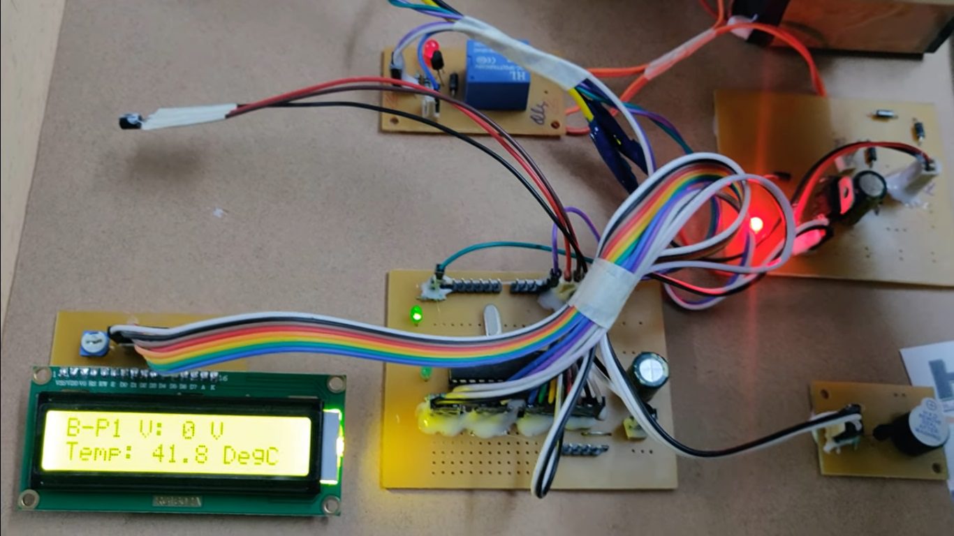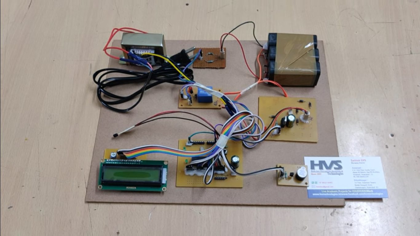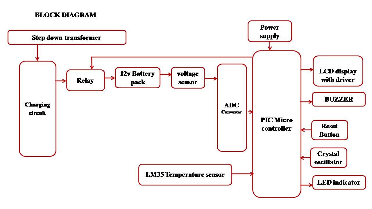 The controlling device of the whole system is PIC microcontroller. The integrated modules to the controller are temperature sensor, Battery pack along with relay, Charger and LCD Module. When any of the battery pack get drained, that battery pack get charged from the charger through relay and the voltage value of each battery pack is displayed on LCD module as well as it displays the temperature continuously. If the temperature value crosses the set limit, then PIC microcontroller active the buzzer for alerts.