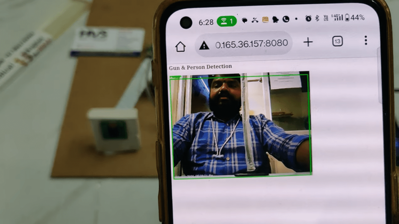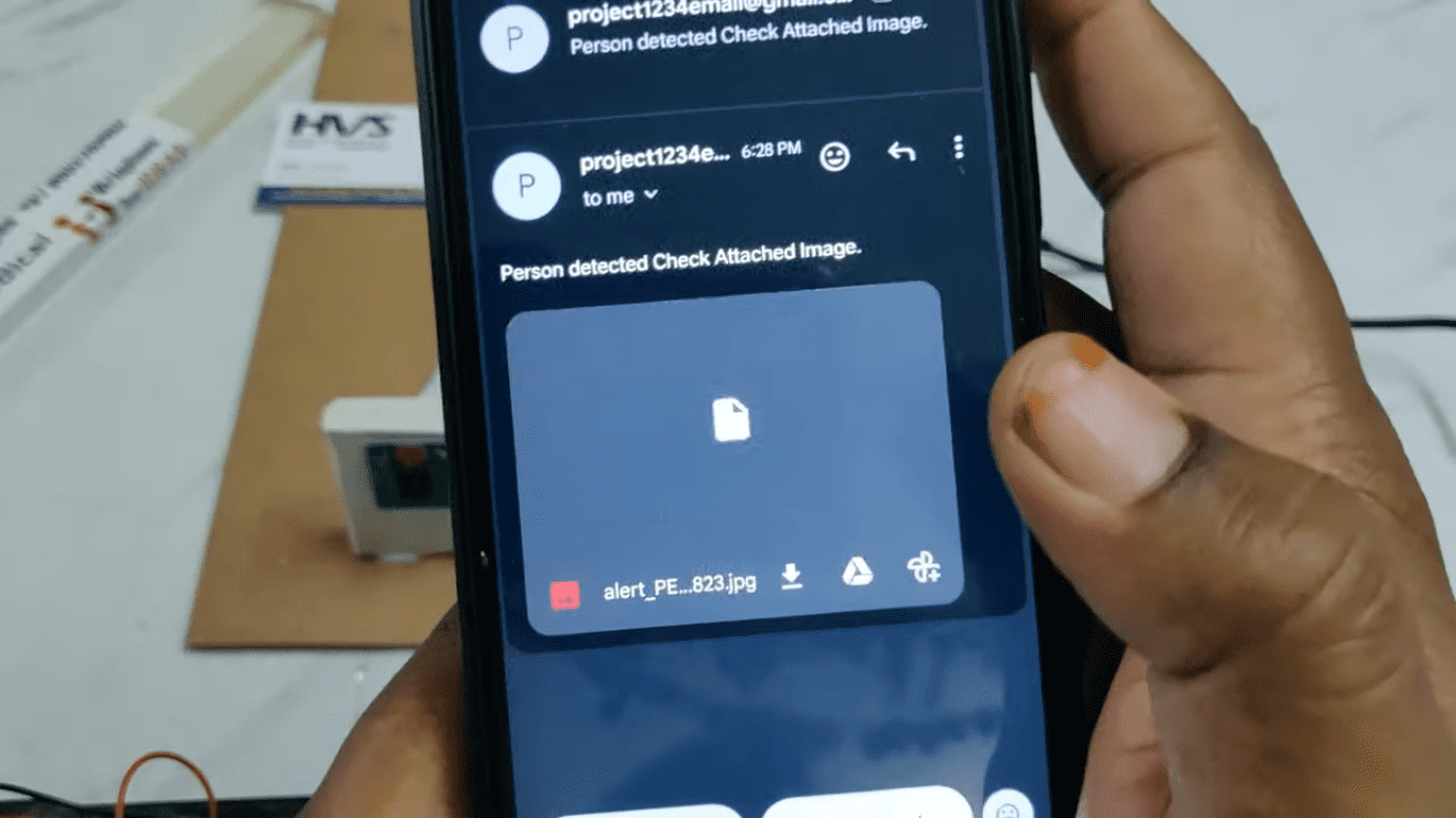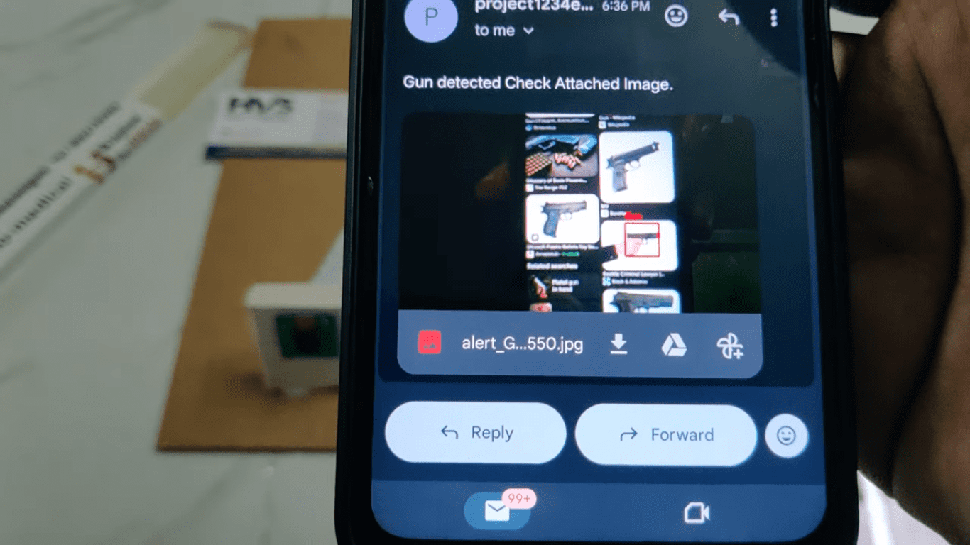 When a human or weapon is detected, the system immediately triggers multiple alert mechanisms. The detection result is displayed on an LCD screen through an I2C interface, and a buzzer is activated to provide an audible warning. Simultaneously, the system captures an image of the detected object and sends an email notification to the registered user along with the captured photo as evidence for remote monitoring and quick response.