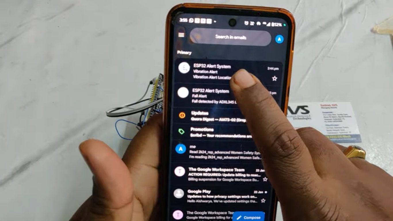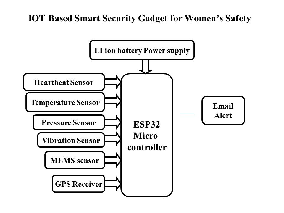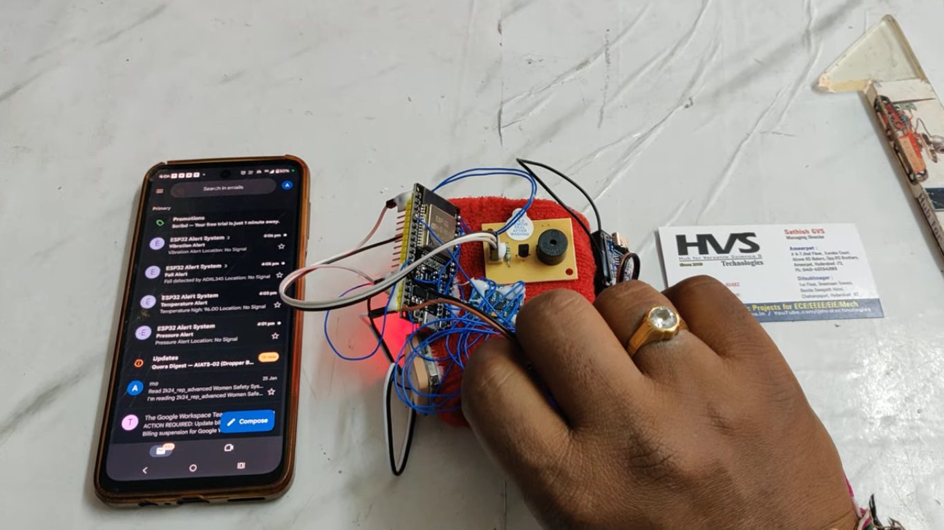 The gadget integrates a heartbeat sensor, temperature sensor, pressure sensor, vibration sensor, and MEMS sensor to detect abnormal physiological changes, sudden movements, or force applied to the device. A GPS receiver is used to obtain the real-time location of the user during an emergency. When any unusual condition is detected, the ESP32 processes the sensor data and automatically sends an email alert containing the user’s location and emergency information to predefined contacts via the internet.